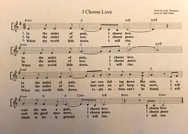 We invite you to take a piece of paper and write your prayers for those injured and killed at the Tree of Life Synagogue. When you are done, please bring your prayer forward and leave it in the bowl on the altar. While you are there you may pick up a rock to take back to your seat with you. When everyone has added their prayer to the altar and picked up a rock we will process outside to complete the ritual. There we will leave our rocks at the root of a tree and sing a closing song.