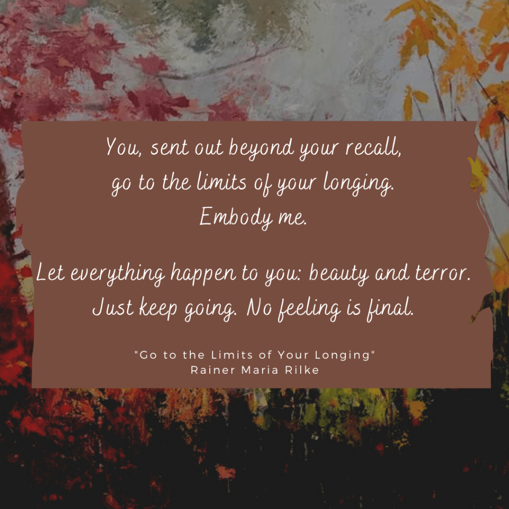 “You sent out beyond your recall to go to the limits of your longing. Embody me. Let everything happen to you: beauty and terror. Just keeping going. No feeling is final” from “Go the Limits of Your Longing” by Rainer Maria Rilke